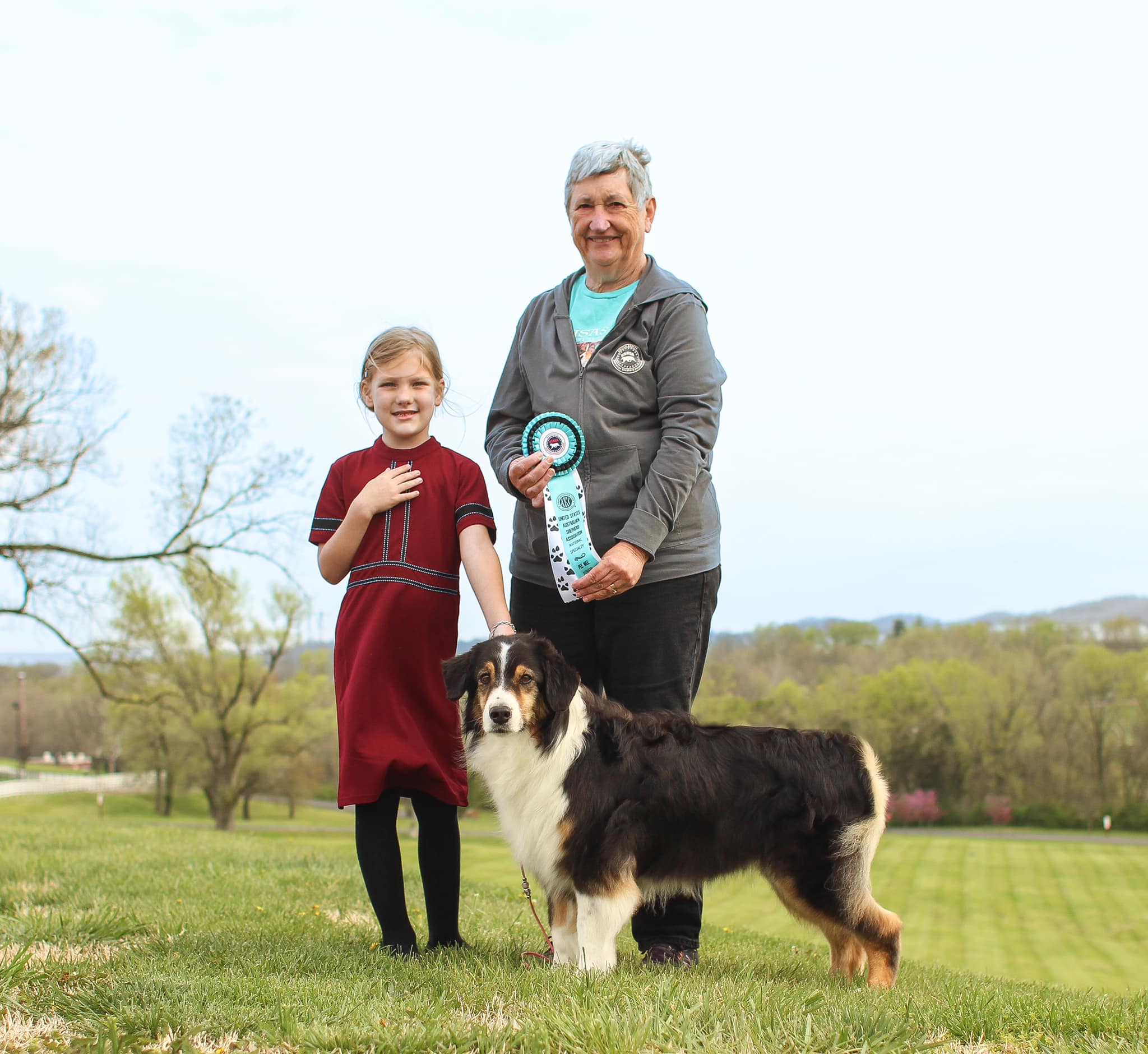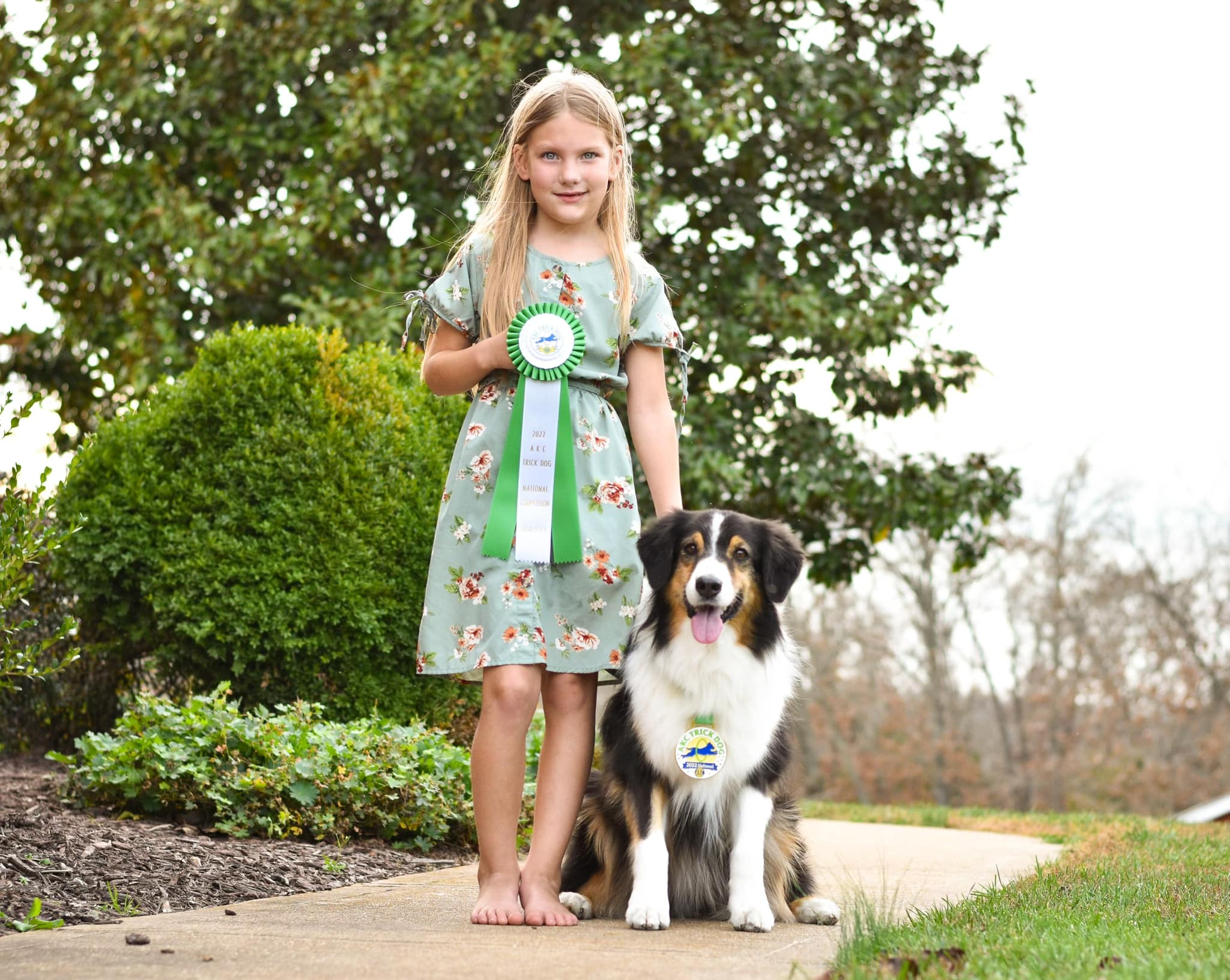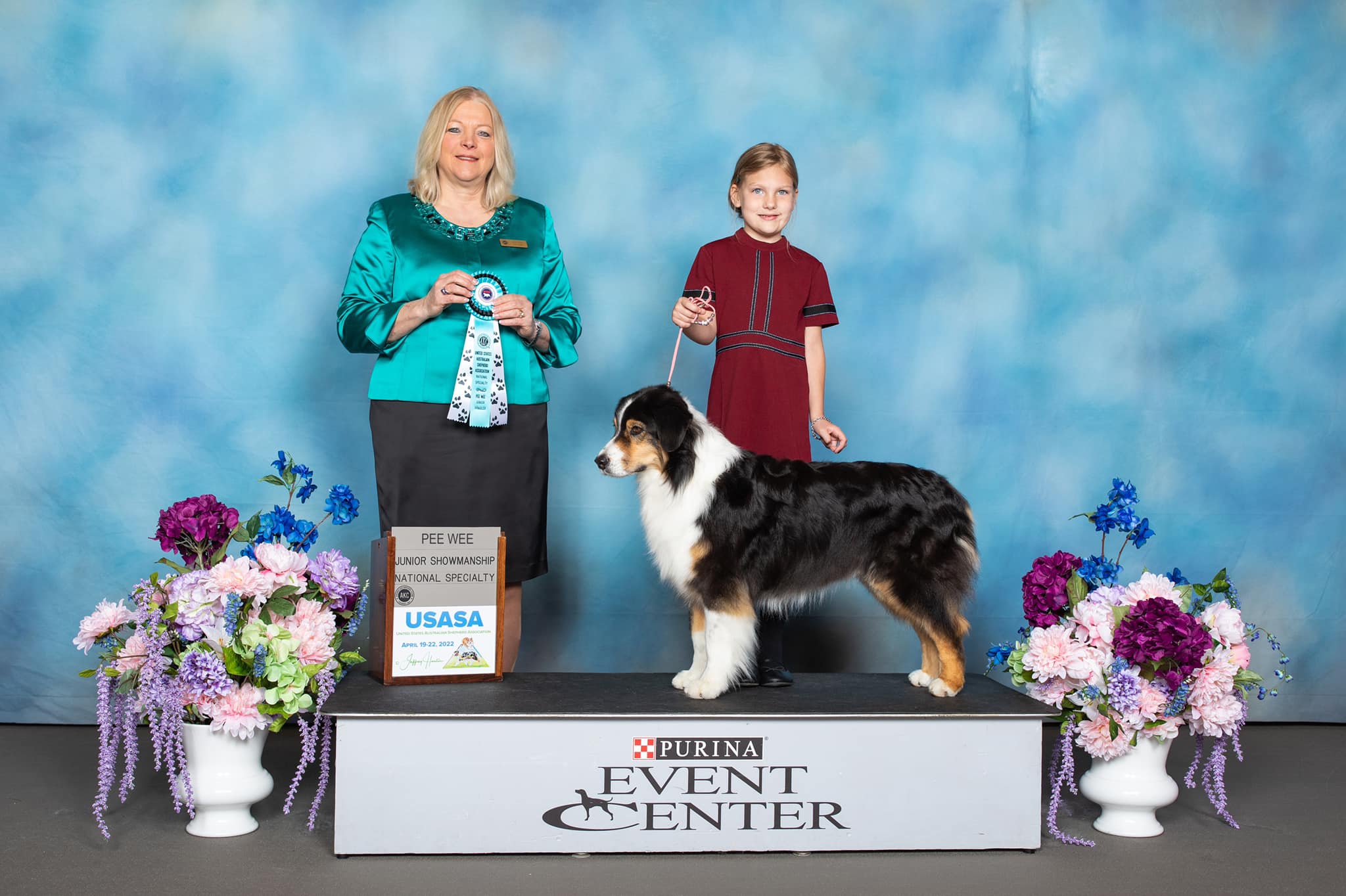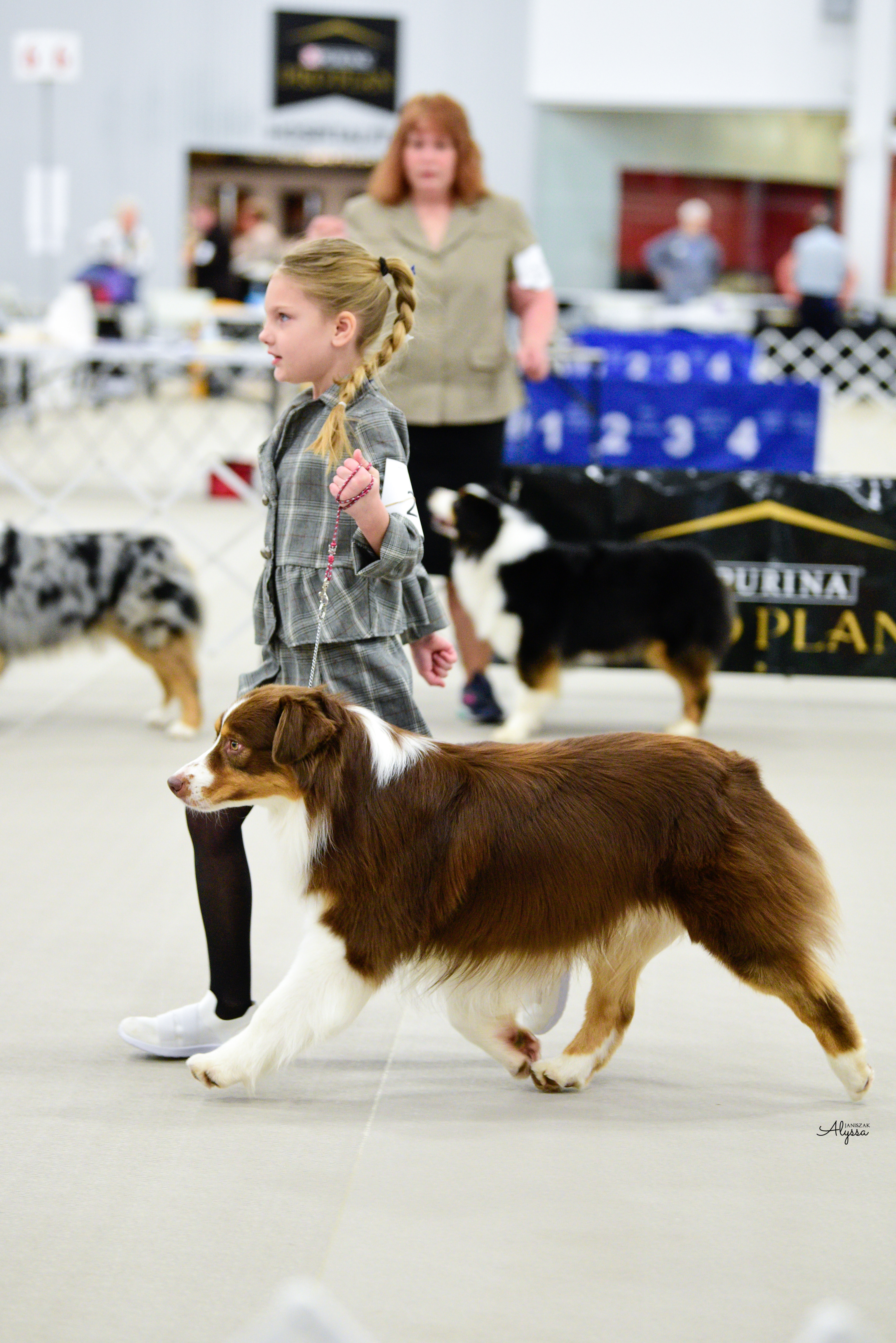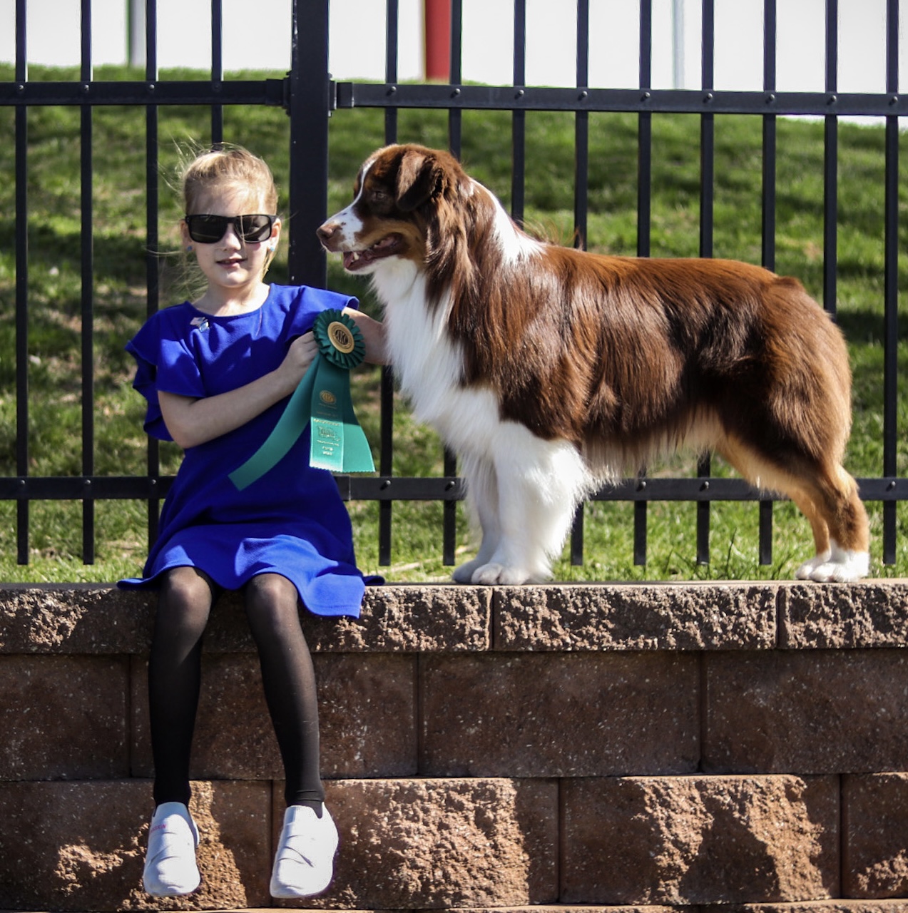 T joined our family at the start of 2023 and is co-owned with Harper, Mari Jebens, and his breeders at Antebellum Aussies. He resides full time at Enroute, competing with Harper in the Breed ring and the Juniors ring. He is teaching her so much about showing and dogs. We absolutely adore this boy and couldn’t be happier.