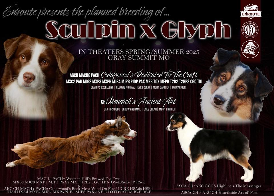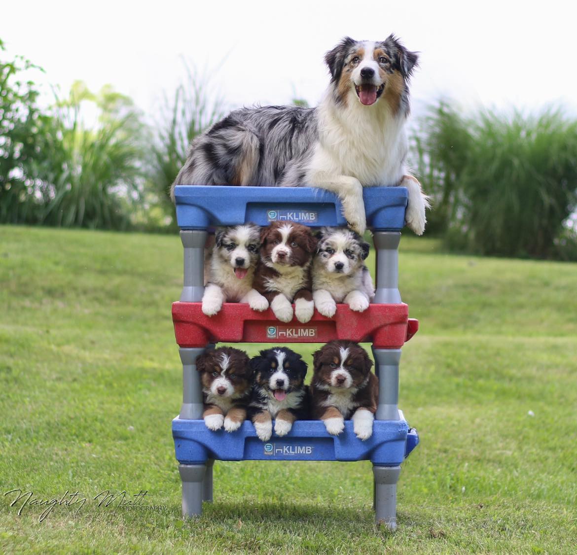 We leased Glyph from Monarch Aussies to get another versatility litter with Sculpin, the litter was born mostly piebald – while these puppies will be AMAZING competitors, they all kept their tails and will not be shown in Conformation. We look forward to their performance dog journeys!